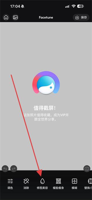 4、在修圖美容功能選擇界面,可選擇功能對照片進行美化,再點擊右上角的保存按鈕,保存修圖后的照片。