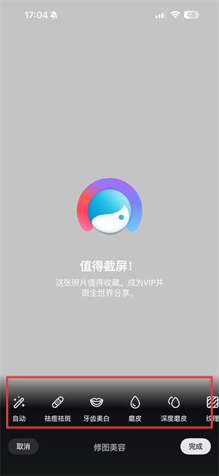 3、照片導入后,點擊底部的修圖美容按鈕,進入修圖美容功能選擇界面。