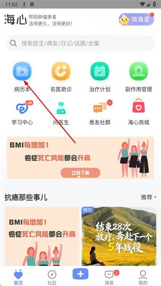1、打開(kāi)海心抗癌APP,在首頁(yè)點(diǎn)擊病歷本。