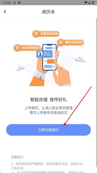 2、在病歷本頁(yè)面點(diǎn)擊立即創(chuàng)建病歷。