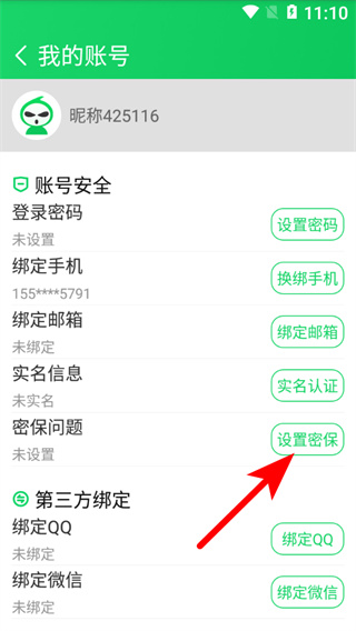 3、在我的賬號界面,點(diǎn)擊設(shè)置密保選項(xiàng),進(jìn)入設(shè)置密保頁面。