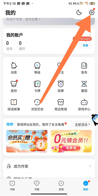 1、在QQ閱讀我的頁(yè)面,點(diǎn)擊右上角設(shè)置圖標(biāo),進(jìn)入設(shè)置頁(yè)面。