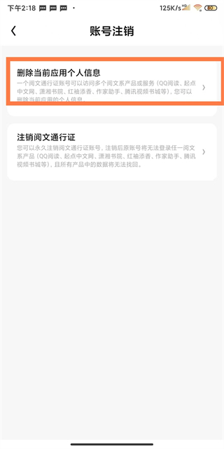 3、在賬號(hào)注銷(xiāo)頁(yè)面,點(diǎn)擊刪除當(dāng)前應(yīng)用個(gè)人信息選項(xiàng),進(jìn)入確認(rèn)刪除頁(yè)面。