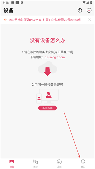 1、打開向日葵遠(yuǎn)程控制App,進(jìn)入主界面后點(diǎn)擊下方設(shè)備選項(xiàng),在設(shè)備頁面點(diǎn)擊右上角的+號按鈕,打開添加設(shè)備菜單。