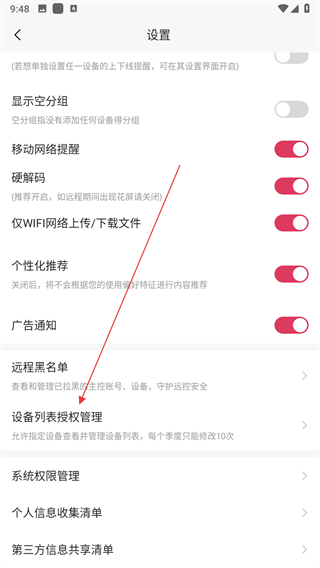 3、在設(shè)置界面中,找到并點(diǎn)擊設(shè)備列表授權(quán)管理選項(xiàng),進(jìn)入設(shè)備列表授權(quán)管理頁面。