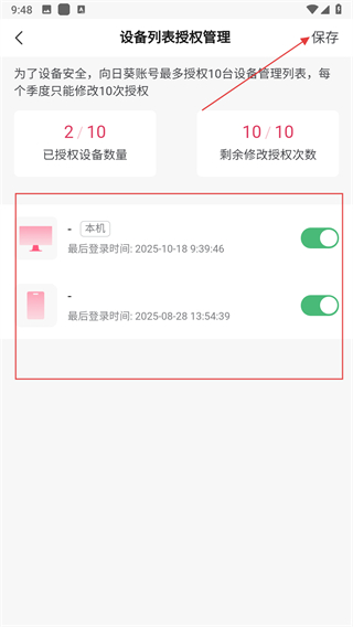 4、在管理頁面,可查看并對列表中的設(shè)備進(jìn)行授權(quán)開關(guān)操作,設(shè)置完成后點(diǎn)擊保存即可。