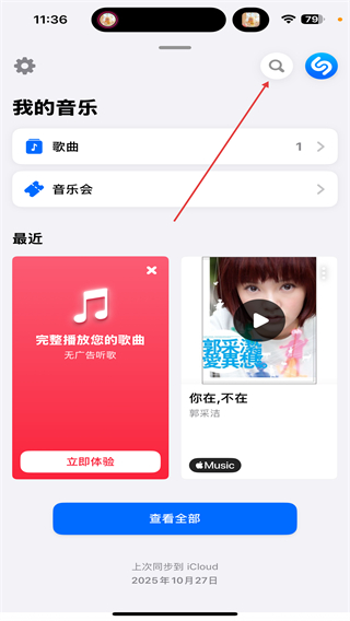 2、進(jìn)入我的音樂(lè)頁(yè)面內(nèi),點(diǎn)擊右上搜索的功能圖標(biāo)。