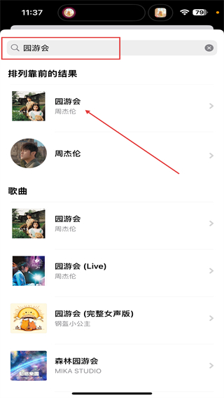 4、在輸入框內(nèi)輸入歌曲名稱(chēng)后,點(diǎn)擊下方對(duì)應(yīng)曲目即可。