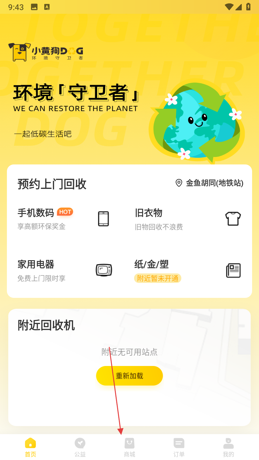 1、打開小黃狗回收員APP,在首頁點(diǎn)擊底部商城按鈕,進(jìn)入小黃狗商城頁面。