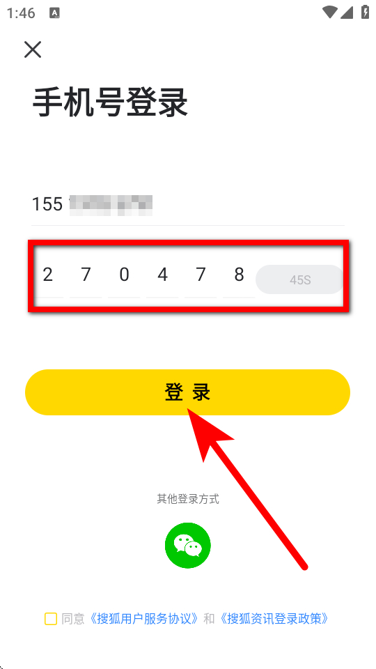4、輸入收到的驗(yàn)證碼,點(diǎn)擊登錄按鈕,完成搜狐資訊賬號(hào)登錄操作。