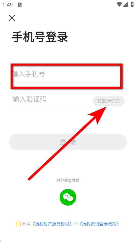 3、在手機(jī)號(hào)登錄頁面,輸入手機(jī)號(hào),點(diǎn)擊獲取驗(yàn)證碼。