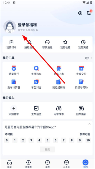 1、打開(kāi)易車汽車報(bào)價(jià)app,點(diǎn)擊右下角我的選項(xiàng),進(jìn)入個(gè)人頁(yè)面。