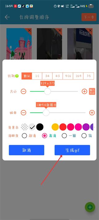 5、在這里為自己選擇點(diǎn)擊比例、大小、幀率、背景色、清晰度,制作出自己想要的gif最終效果,設(shè)置完成之后就可以點(diǎn)擊【生成gif】;