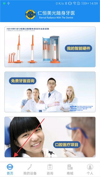 3、注冊(cè)完成后,即可進(jìn)入APP首頁(yè),使用我的智能硬件、免費(fèi)牙醫(yī)咨詢、口腔醫(yī)療項(xiàng)目等相關(guān)功能。