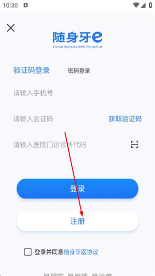 1、打開隨身牙醫(yī)APP,在登錄頁(yè)面點(diǎn)擊注冊(cè)。