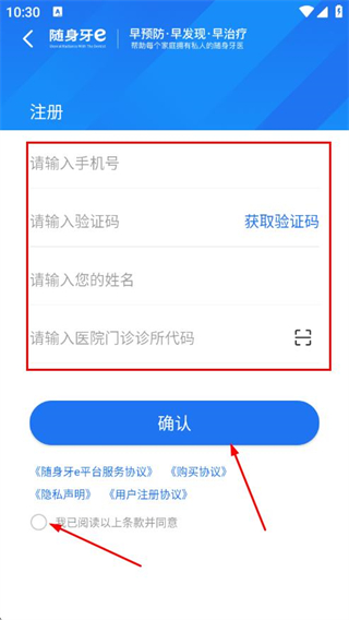 2、在注冊(cè)頁(yè)面輸入手機(jī)號(hào),點(diǎn)擊獲取驗(yàn)證碼并填入,輸入姓名和醫(yī)院門診診所代碼,勾選條款,點(diǎn)擊確認(rèn)。