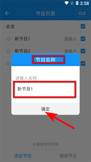4、在節(jié)目名稱設(shè)置框中,輸入節(jié)目名稱后點(diǎn)擊確定,完成新節(jié)目添加操作。