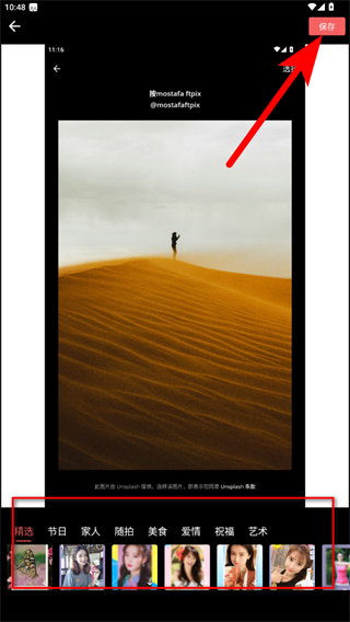 3、進(jìn)入照片編輯頁面后,可在底部選擇精選、節(jié)日、家人等不同風(fēng)格的模板。