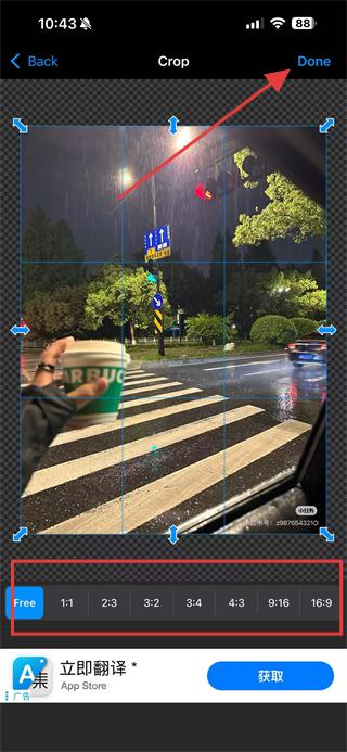3、照片載入后,進(jìn)入裁剪界面,可按照自由或預(yù)設(shè)的比例對(duì)照片進(jìn)行裁剪,完成后點(diǎn)擊Done。
