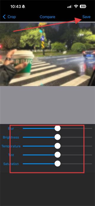 4、在編輯界面,通過(guò)調(diào)節(jié)等參數(shù)來(lái)調(diào)整照片效果,調(diào)整滿(mǎn)意后點(diǎn)擊Save保存處理后的照片。