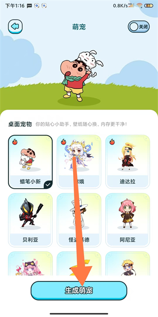 3、在萌寵選擇界面,選擇喜歡的萌寵后點(diǎn)擊生成萌寵按鈕,完成桌寵設(shè)置操作。
