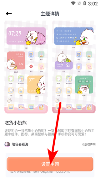 3、在主題詳情頁,點擊“設置主題”按鈕,按提示完成操作,即可將該主題應用到手機桌面小組件。