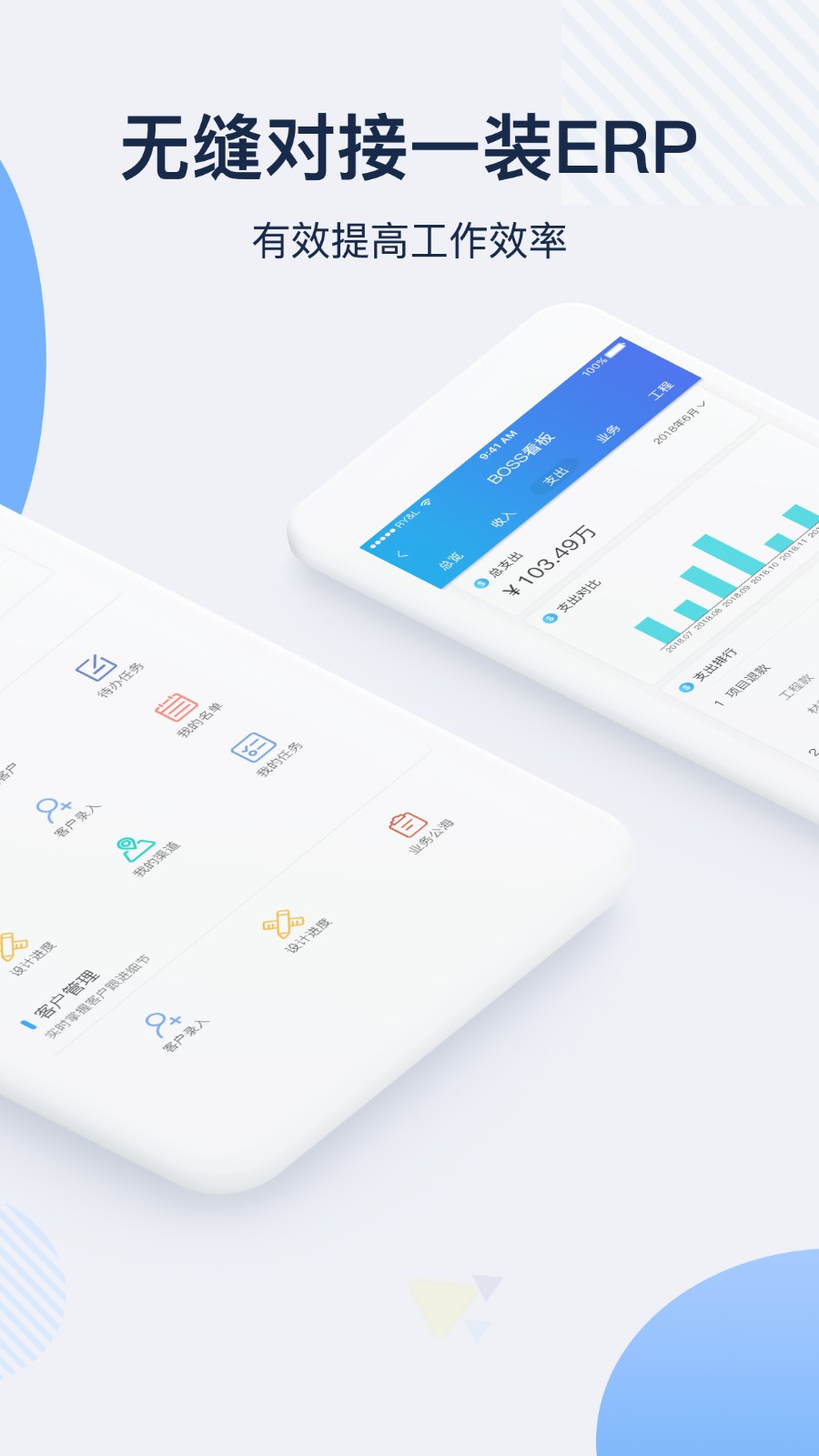 一裝ERP專為裝企量身定制的全流程管理系統(tǒng),10年行業(yè)經(jīng)驗(yàn)助力裝企快速發(fā)展!移動審批、考勤打卡、報表功能、客戶管理、方案量房、報價選材、現(xiàn)場管理、采購管理、財(cái)務(wù)管理、全員營銷等豐富功能。配套PC端應(yīng)用,全面提升裝企辦公效率,解決裝企客戶流失、報價混亂、施工差、利潤少、結(jié)算煩等一系列管理問題!