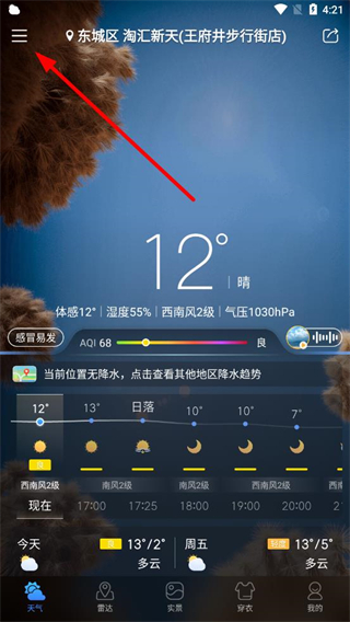 1、在天氣通app界面點(diǎn)擊左上角三條橫線圖標(biāo),進(jìn)入城市管理頁(yè)面。