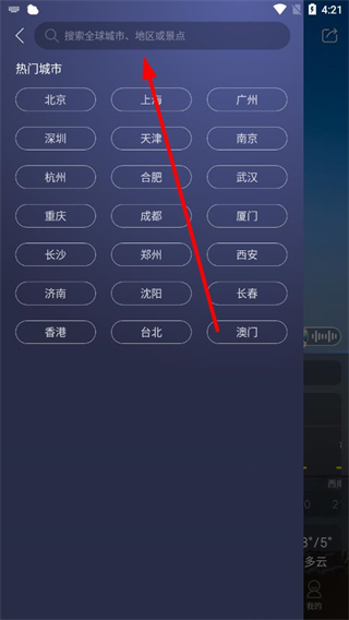 3、在城市搜索頁(yè)面的搜索框中輸入想要添加的城市名稱,或在熱門城市中選擇城市。