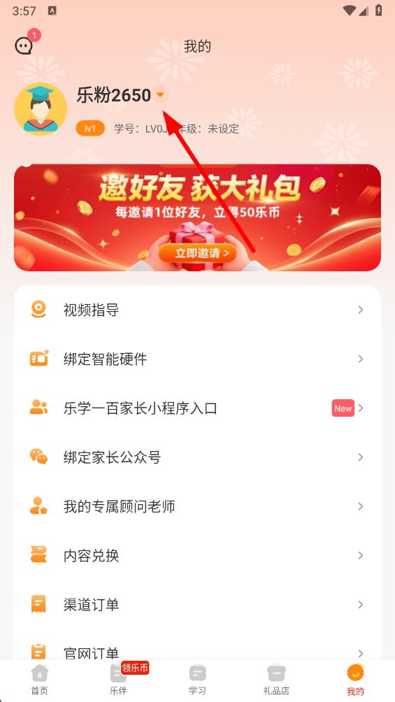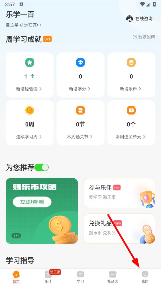 1、打開(kāi)樂(lè)學(xué)一百app,在首頁(yè)點(diǎn)擊右下角的我的選項(xiàng),進(jìn)入個(gè)人頁(yè)面。