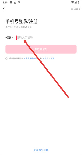 3、跳轉(zhuǎn)到手機號登錄頁面后,可以點擊輸入框填寫手機號,以便獲取驗證碼進行登錄。