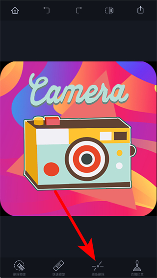 選擇了需要修改的圖片之后,我們可以發(fā)現(xiàn)主頁面也延續(xù)了該應用的簡潔風格。上方功能概括為撤回操作和導出圖片,而主要的四個功能放在下方,分別為刪除物體、快速修復、線條刪除,克隆印章。除此之外,應用中還支持雙指縮放來進行細節(jié)的修改。