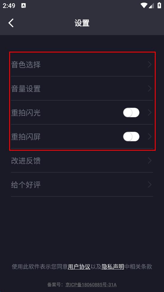 2、在設(shè)置頁面可進(jìn)行音色選擇、音量設(shè)置,還可開啟重拍閃光和重拍閃屏功能。