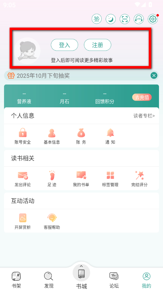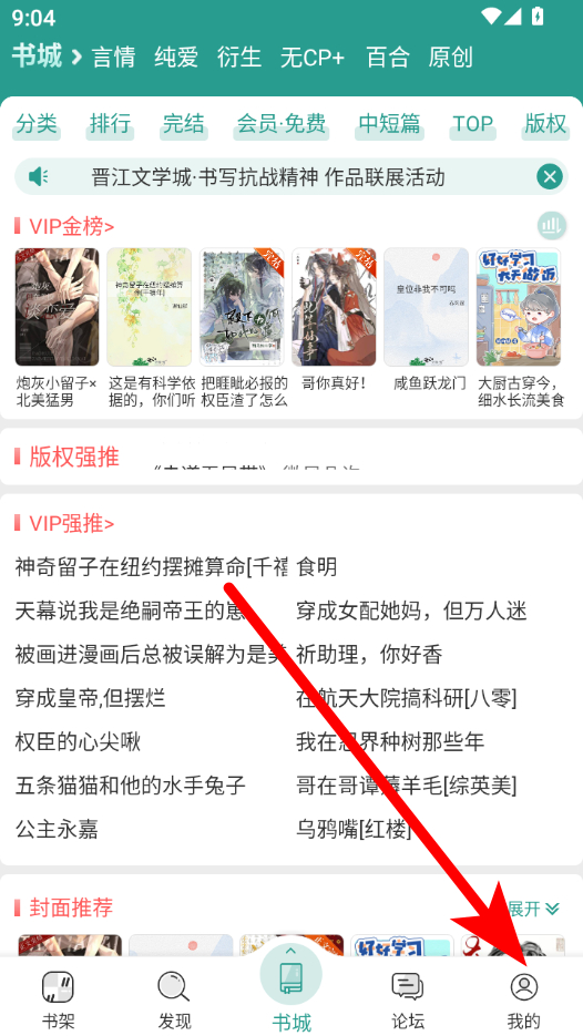 1、在晉江小說閱讀書城頁面,點擊右下角我的選項,進入個人中心界面。