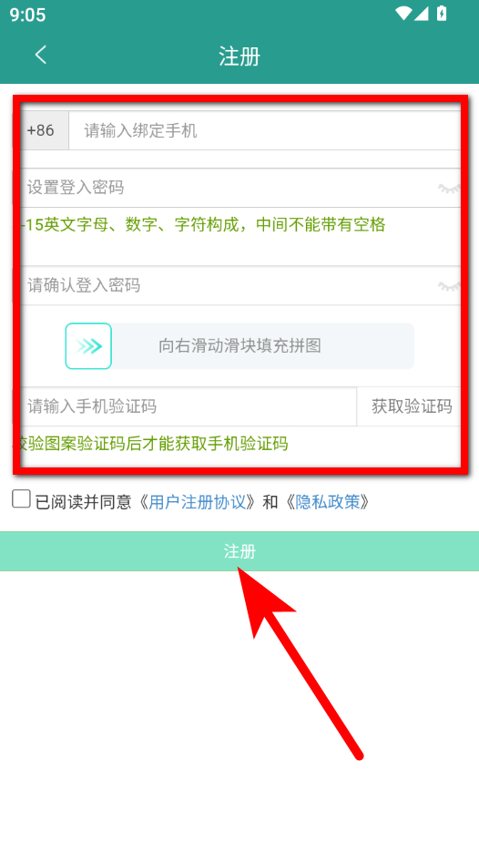 4、按要求填寫手機、密碼等信息后點擊注冊,即可完成賬號注冊操作。