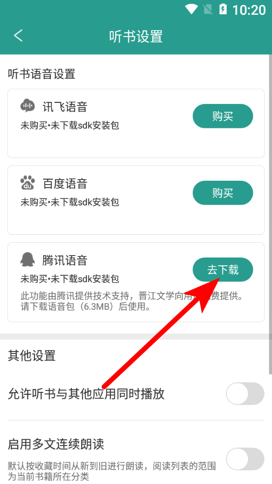 4、選擇語音包后點擊去下載,下載完成后即可使用聽書功能,完成晉江小說閱讀聽書操作。
