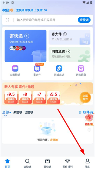 1、在快遞100app首頁點(diǎn)擊我的選項(xiàng),進(jìn)入個人頁面。