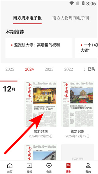 4、若想閱讀《南方人物周刊電子刊》,在報(bào)刊頁面點(diǎn)擊南方人物周刊電子刊選項(xiàng)。