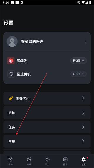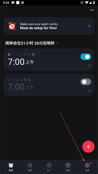 1、打開(kāi)使命鬧鐘應(yīng)用,點(diǎn)擊右下角設(shè)置選項(xiàng)。