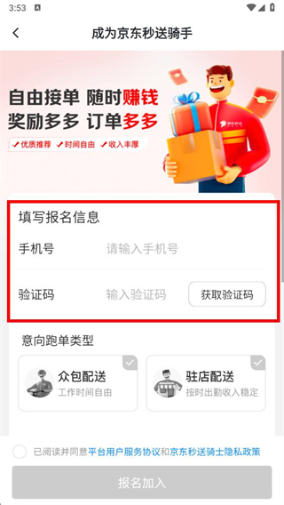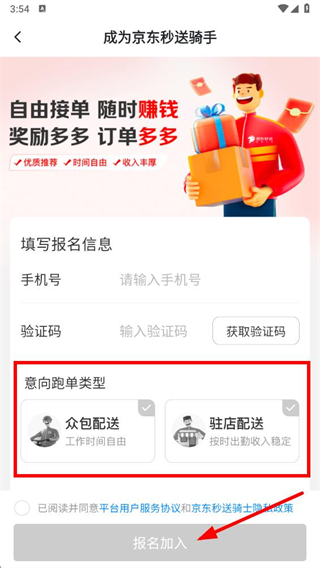4、選擇意向跑單類型,勾選已閱讀并同意相關(guān)協(xié)議后,點擊報名加入按鈕,即可完成騎士注冊。