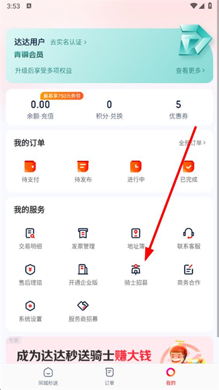 2、在個人頁面點擊騎士招募選項,進入成為京東秒送騎手頁面。