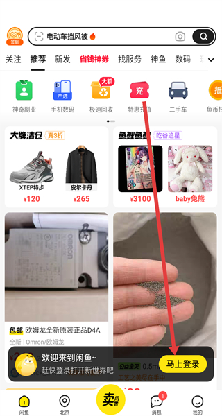 2、在進入到咸魚首頁中,可以點擊下方馬上登錄按鈕,準備開始進行登錄操作。