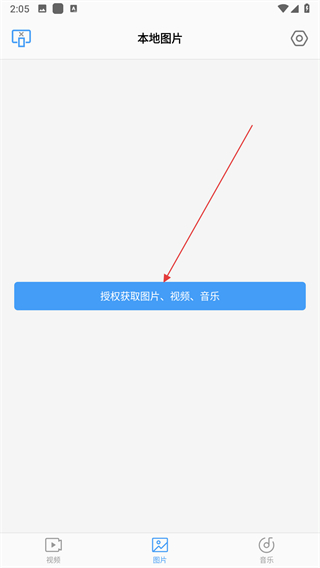 1、打開極速投屏應(yīng)用,在圖片頁(yè)面點(diǎn)擊授權(quán)獲取圖片、視頻、音樂(lè)按鈕。