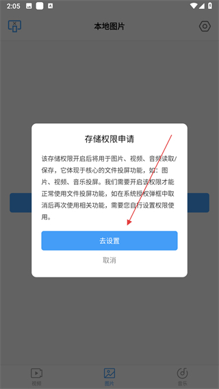 2、在存儲(chǔ)權(quán)限申請(qǐng)彈窗中,點(diǎn)擊去設(shè)置按鈕,完成存儲(chǔ)權(quán)限的開啟。