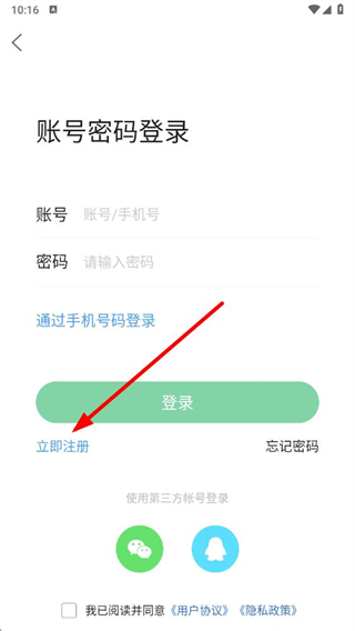 3、在賬號(hào)密碼登錄頁(yè)面點(diǎn)擊立即注冊(cè)選項(xiàng),進(jìn)入輸入手機(jī)號(hào)頁(yè)面。