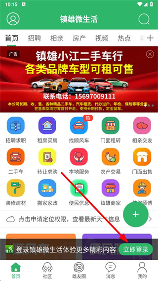 1、在鎮(zhèn)雄微生活app首頁(yè)點(diǎn)擊立即登錄按鈕,進(jìn)入登錄選擇頁(yè)面。