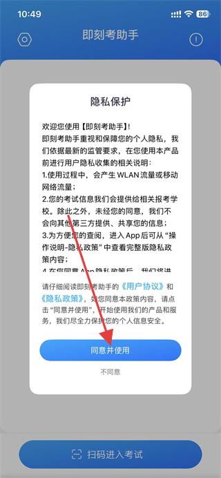 1、打開即刻考助手,在彈出的窗口中,點擊同意并使用。