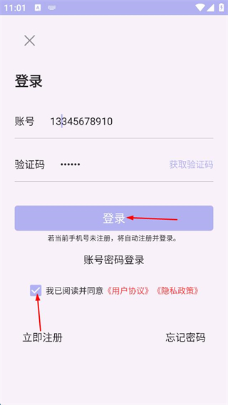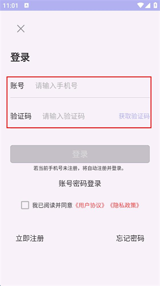 3、在登錄頁面,輸入手機(jī)號,獲取并輸入驗證碼。