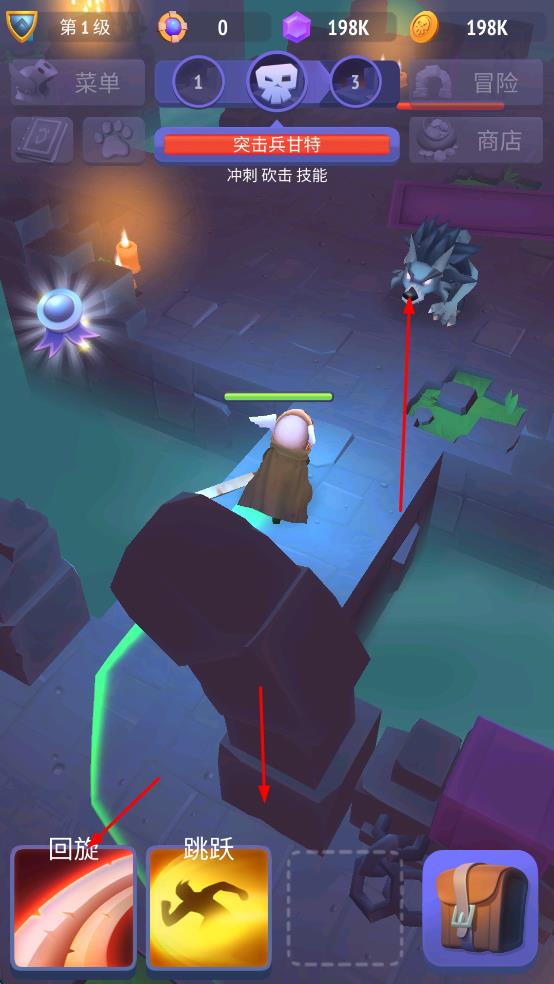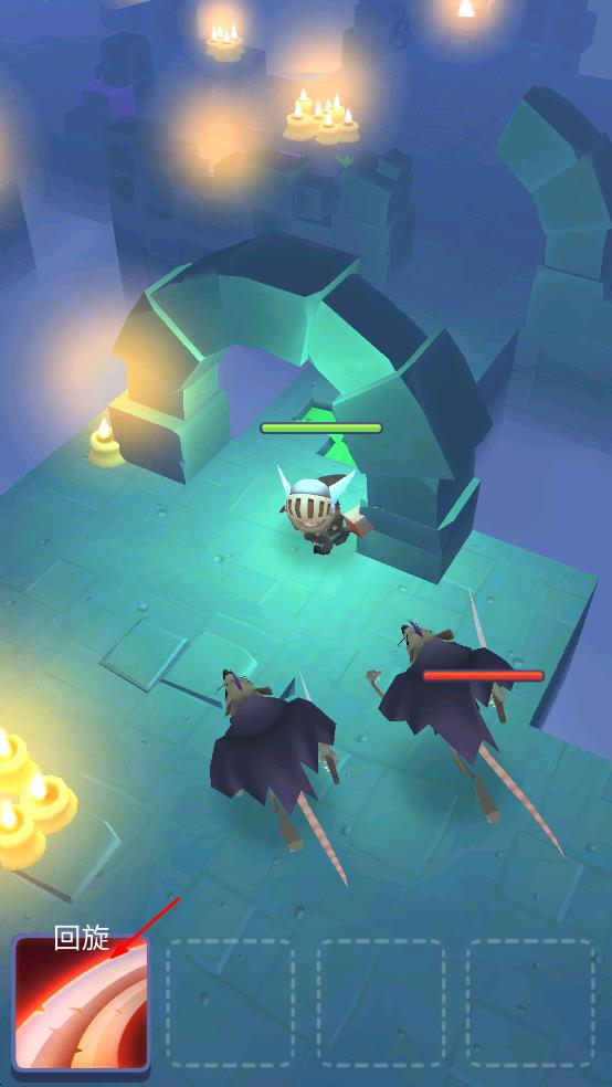 2、在遇到敵人時(shí),觀察敵人位置和自身技能,點(diǎn)擊左下角“回旋”技能按鈕,使角色釋放回旋技能,對(duì)周?chē)鷶橙嗽斐蓚?,同時(shí)注意躲避敵人的攻擊,保證自身安全。