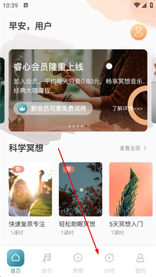 1、打開睿心冥想APP,點擊導(dǎo)航欄計時。